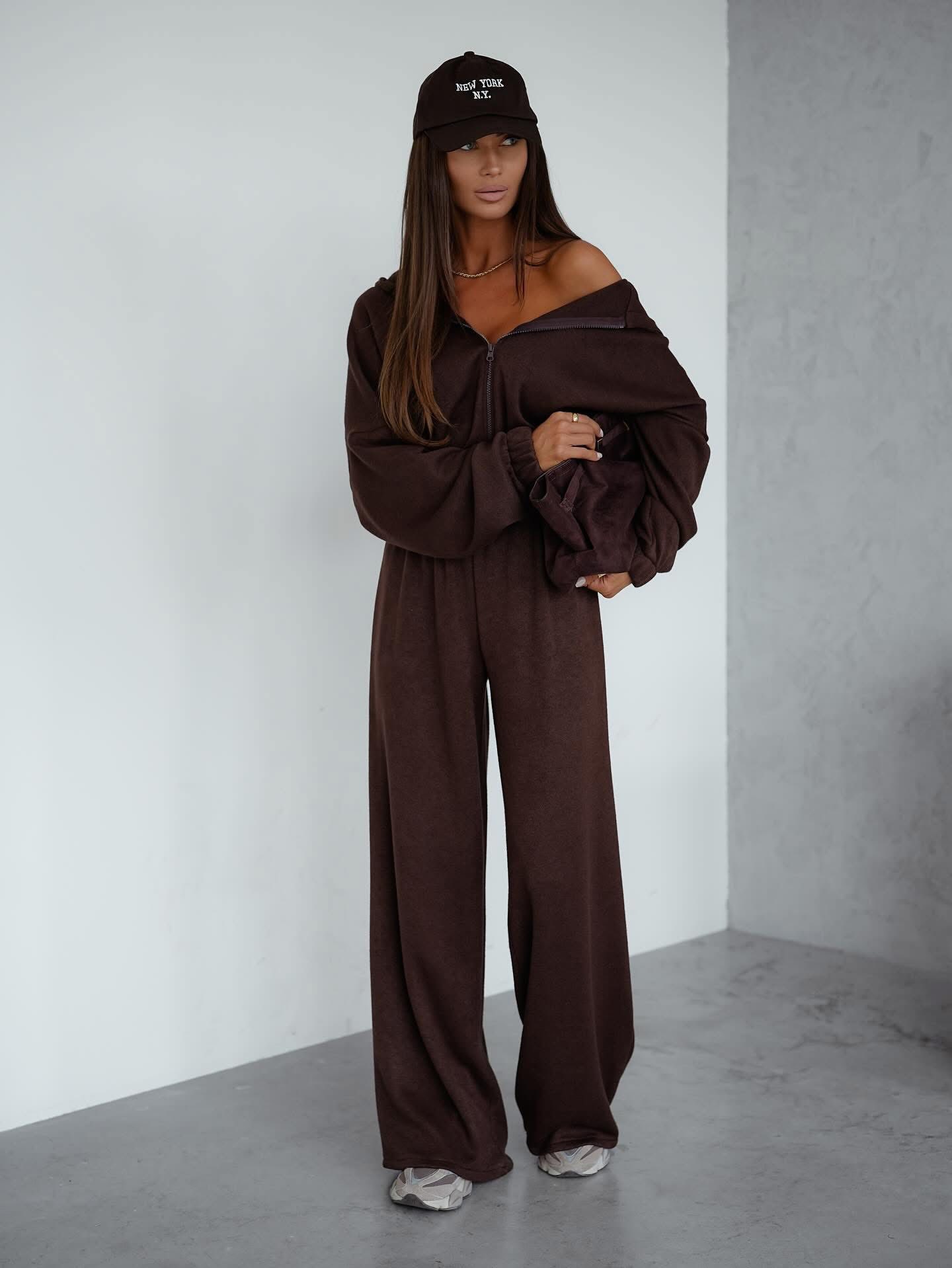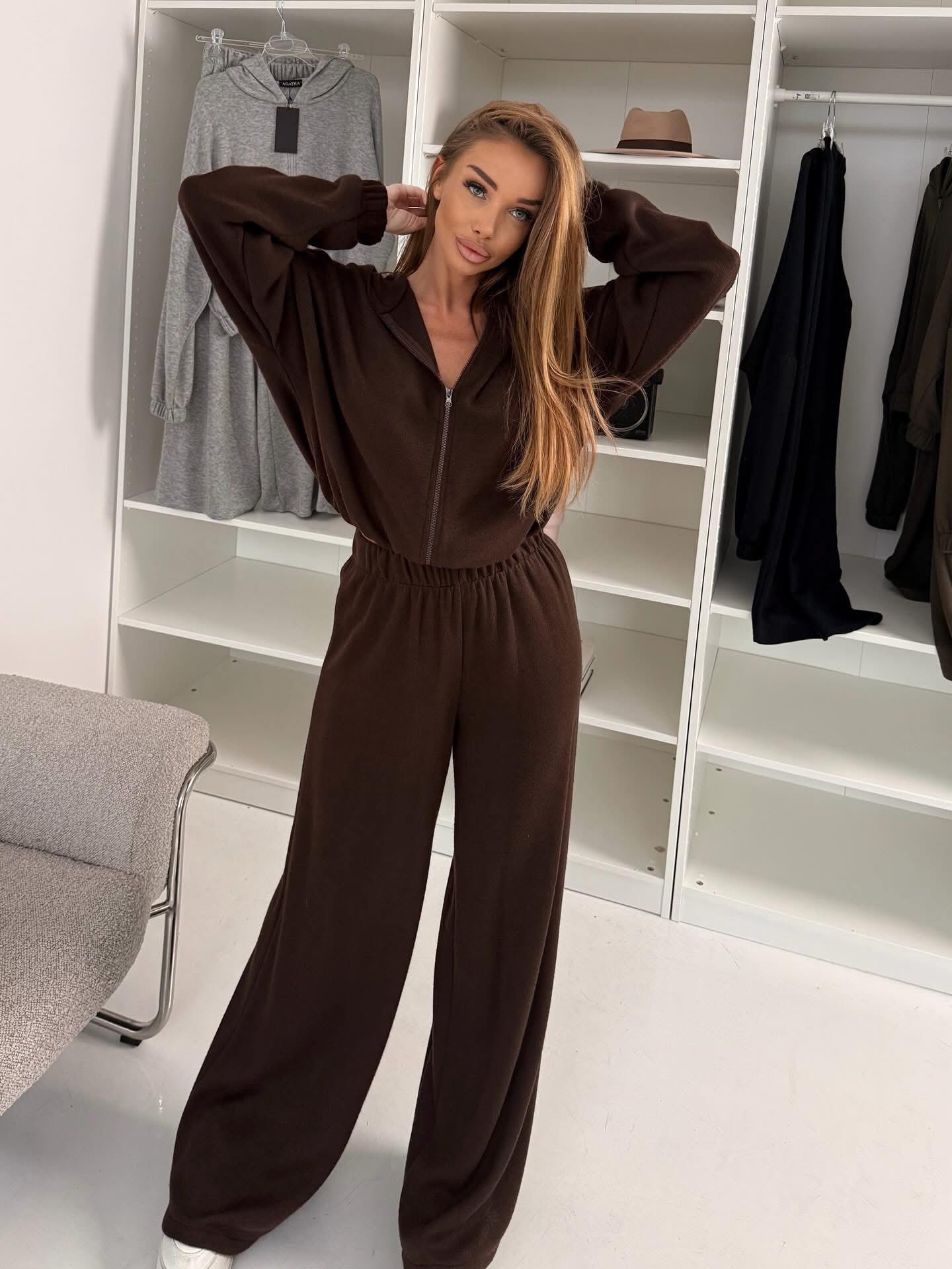 Women’s Knitted Two-Piece Set with Hooded Zip Top- Chocolate