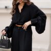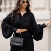 This shirt combines modern sophistication with effortless femininity. The wide, voluminous sleeves create a statement look, while the adjustable waist with a gold clasp allows for a flattering, customizable fit. The cropped design enhances your silhouette and makes this piece perfect for both casual and elegant outfits.